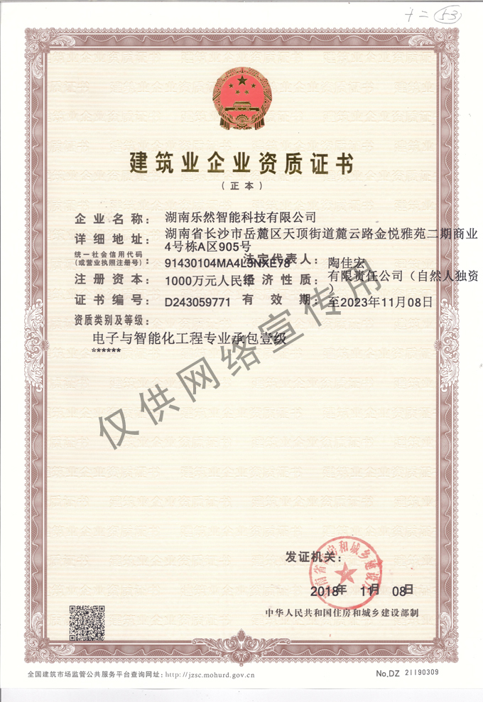 重磅! 湖南乐然公司晋升电子与智能化工程专业承包壹级资质企业